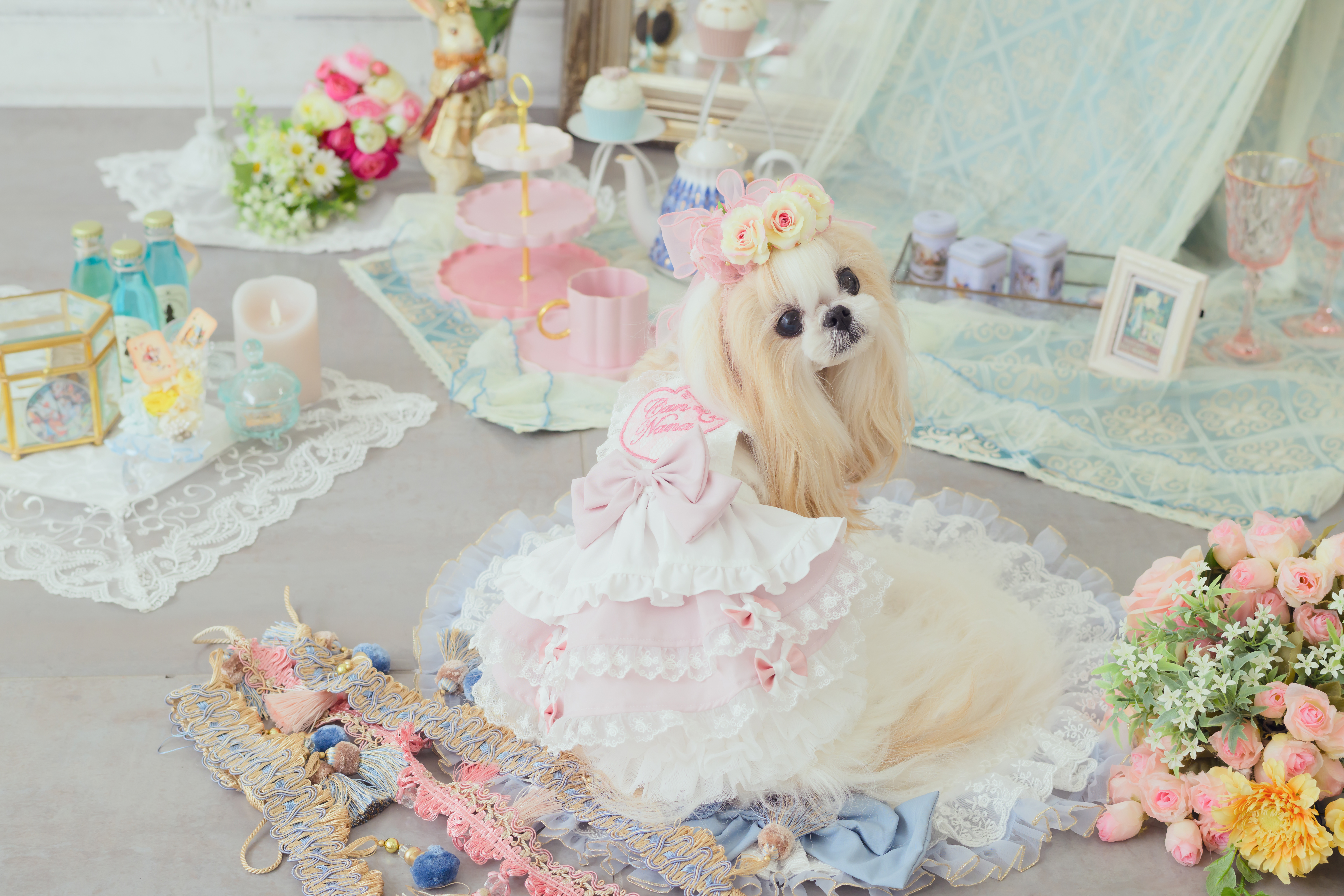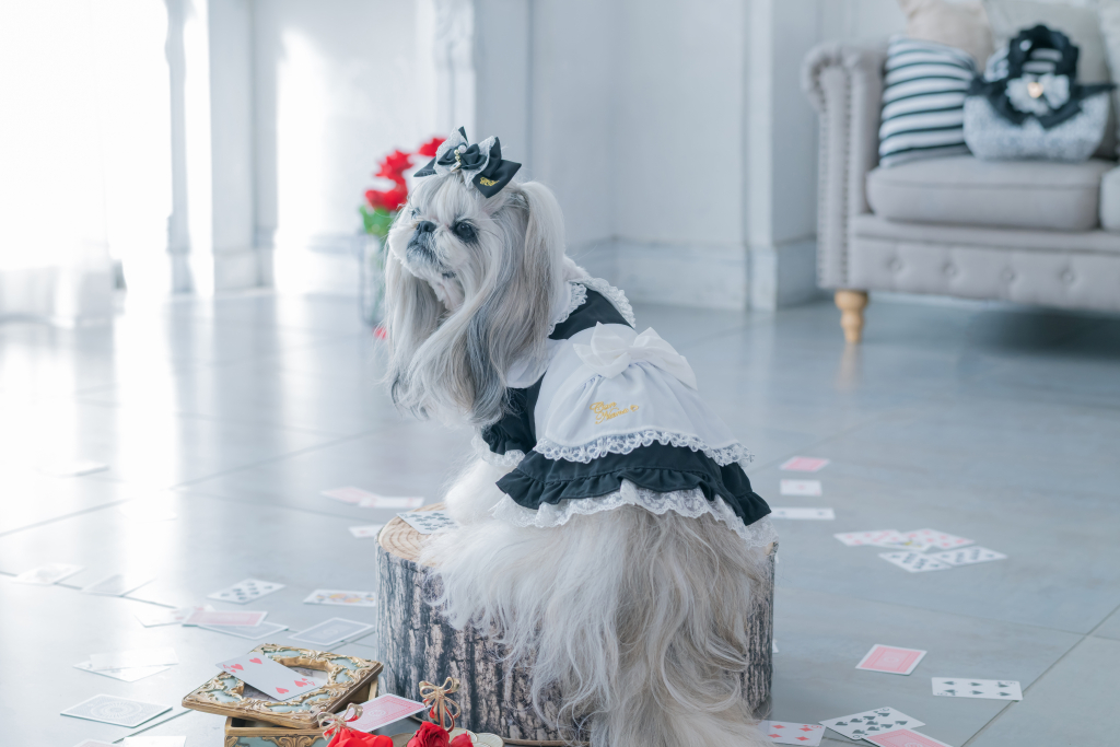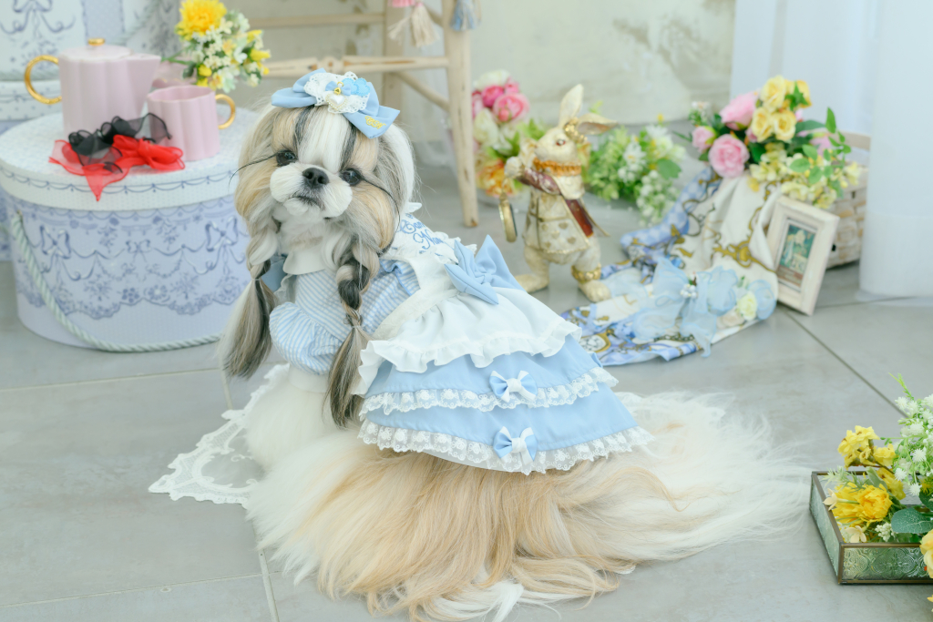 シーズーの毛色別に似合う「アリスワンピース」のカラーコーディネートをご紹介します。